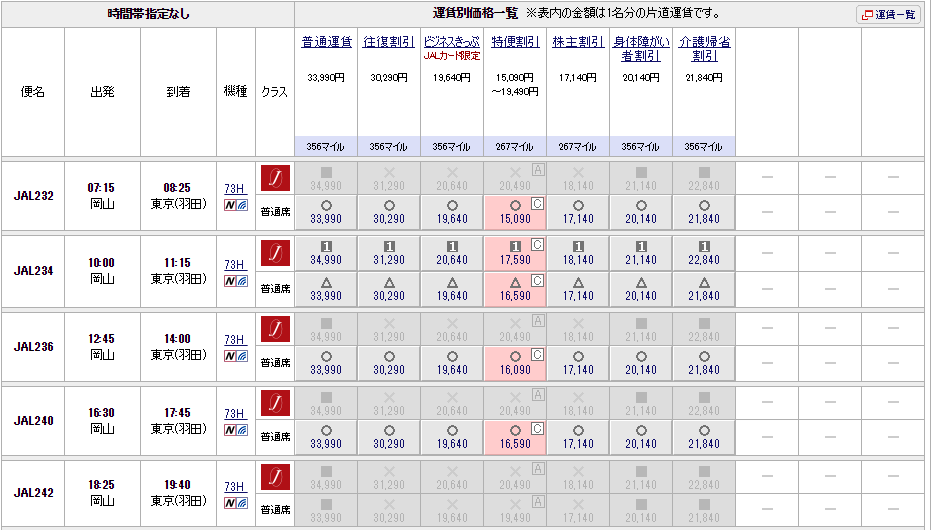 フラッと東京に行ってみようかと思い、JAL国内線の運賃を調べてみました。