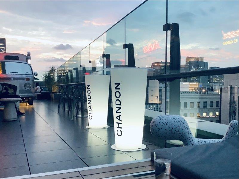 バックステージからランウェイに向かうようなメタリックな通路を抜けると、なかなか建物の屋上からは見ない銀座の夕景が広がってきます。