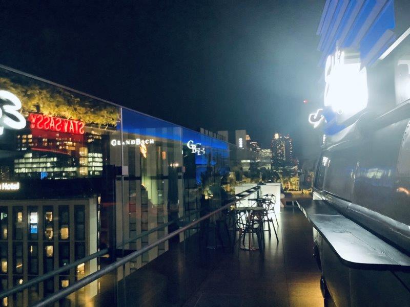 一階のバーカウンターでジントニックをつくってもらい、屋上のラウンジ、その名もROOFDOGに向かいます。