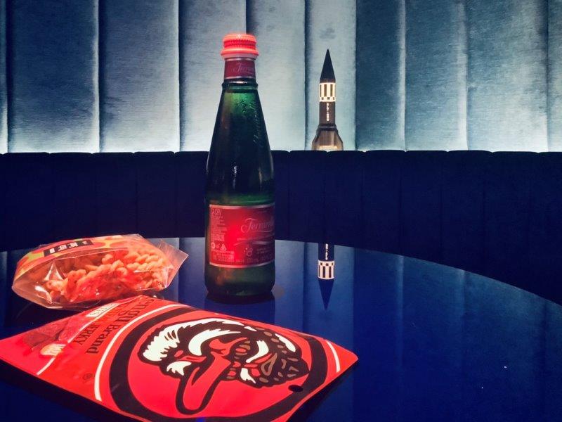 誰もいないビリヤード台を前に、ロビー奥のショップで購入したドリンクとつまみをいただきます。