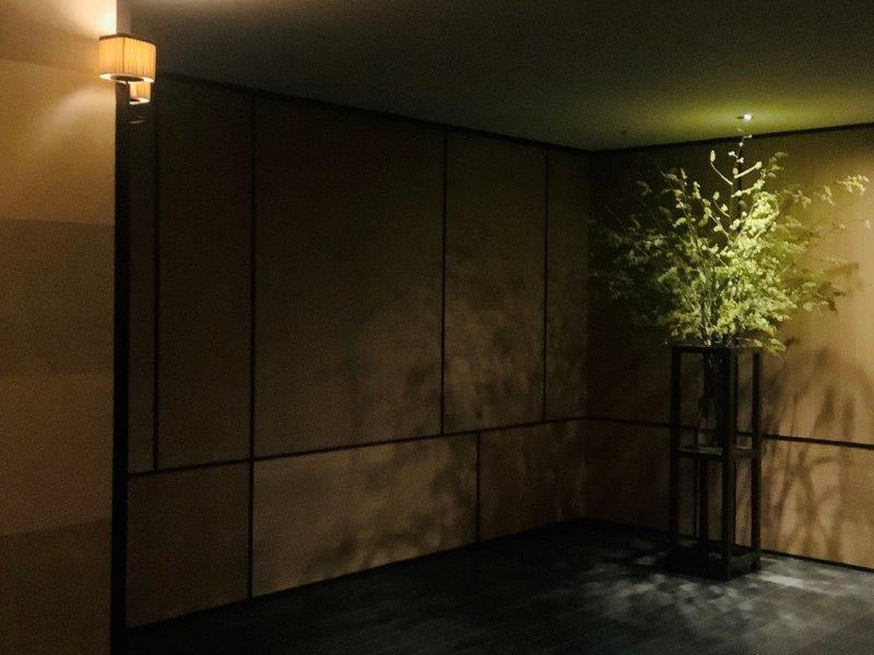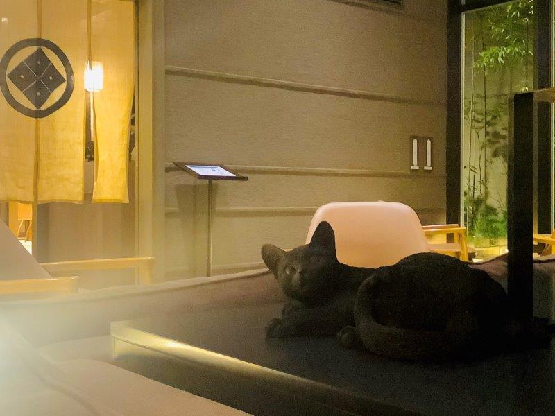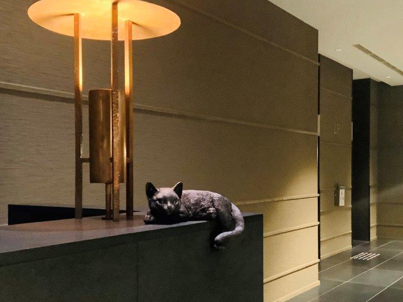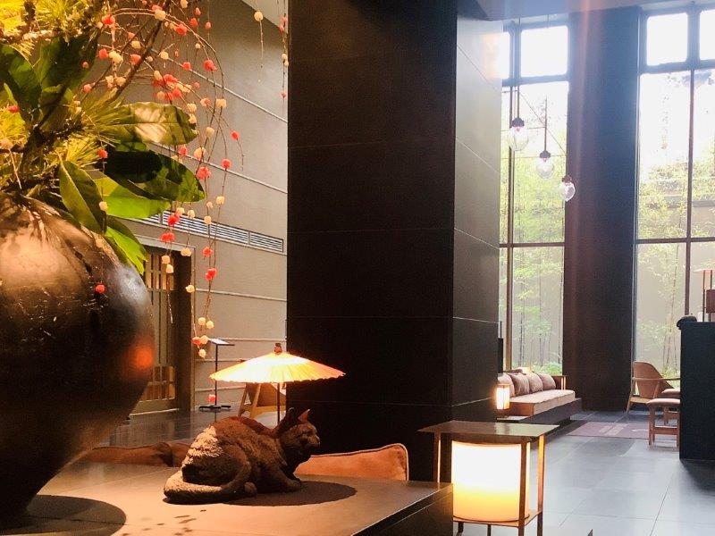 坪庭に向かった吹き抜けが壮大なエントランスには、銀座同様そこかしこに猫の置物がアクセントとして佇んでいます。