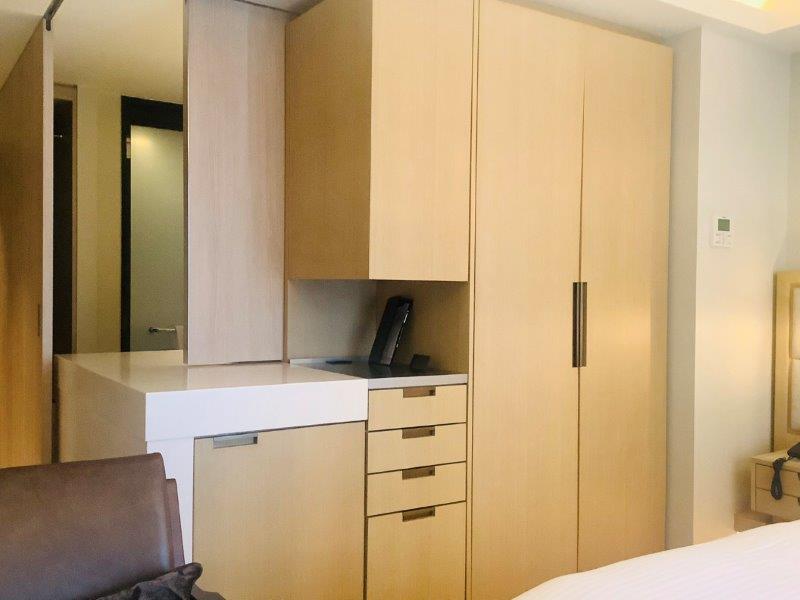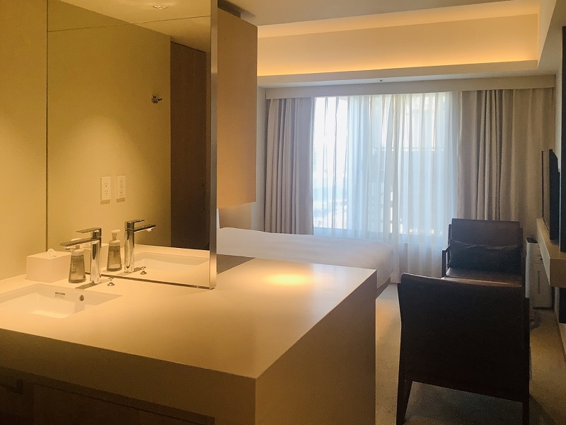 鏡やパーテーションがスライドし、水まわりスペースがパーテーションで区切れるのはコンラッド大阪や虎ノ門のアンダーズなど昨今の流れですね。