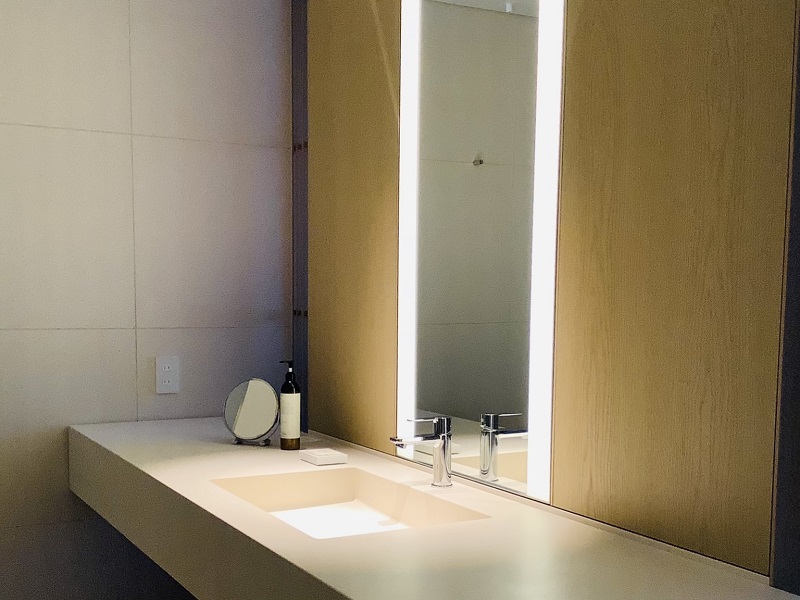 大きなコーリアンの洗面台の中央にシンクがひとつ、とても象徴的でシンプルな構成です。