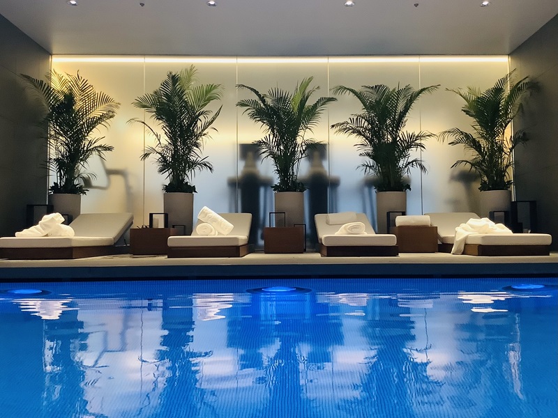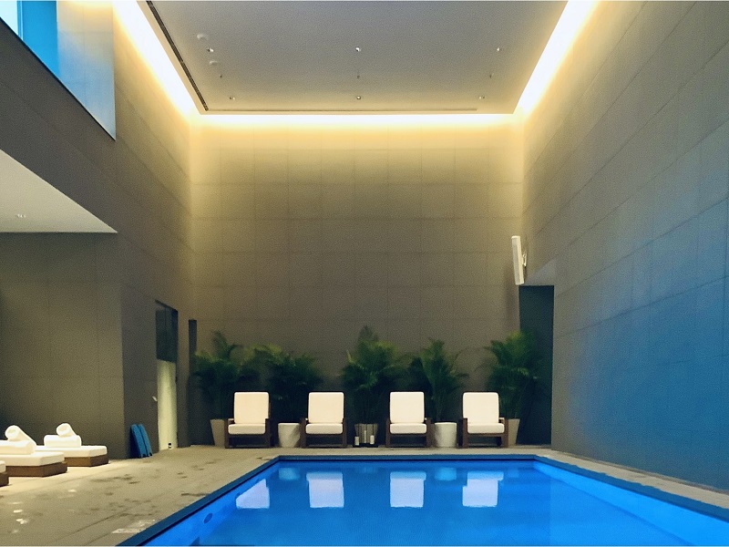 青いビームライトに照らされた荘厳なプールがモノリシックな背景とともにむかえてくれます。