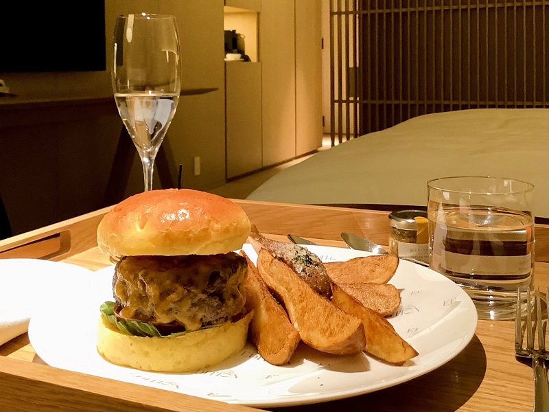 夜はインルームダイニングで和牛バーガーとディープフライポテトを頼みます。