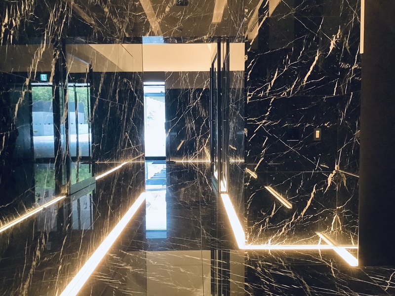 廊下やエレベーターといった何気ない空間をとってみても、どこまでもシンプルながら色気のある空間です。