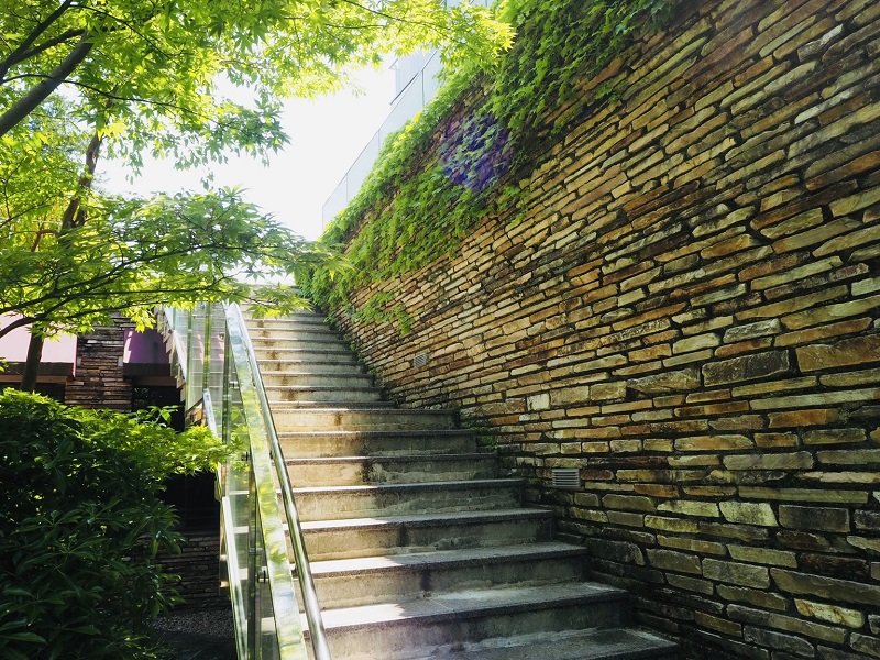 木片やテラコッタのブロックが織りなす力強くもリズミカルな壁面がオリエンタルな迷宮の様相を呈しています。