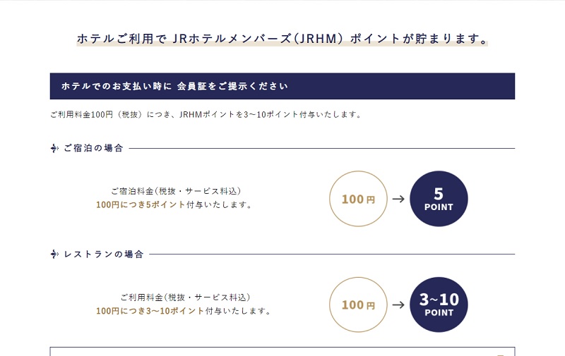 ポイント付与レートはホテルによって異なりますが、利用料金100円(税抜)につきJRHMポイントを3~10ポイント付与されます。