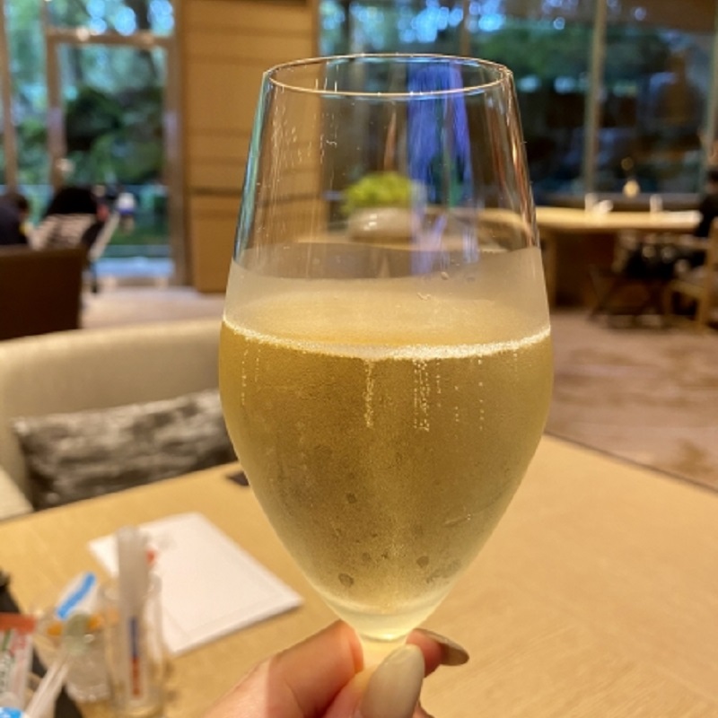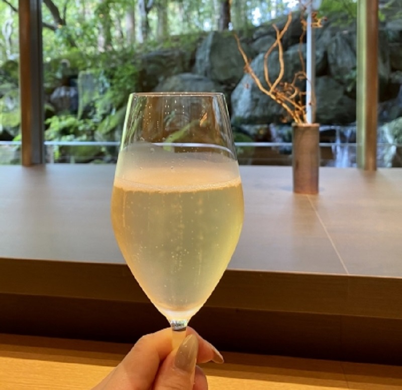 ほんで、さっきの和服のおねえさんが「お電話でシャンパンがお好きと聞いております。」と、カクテルタイム前にシャンパンを持ってきてくださいました。