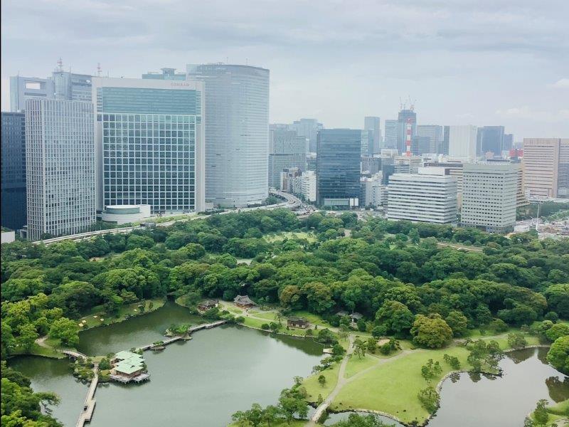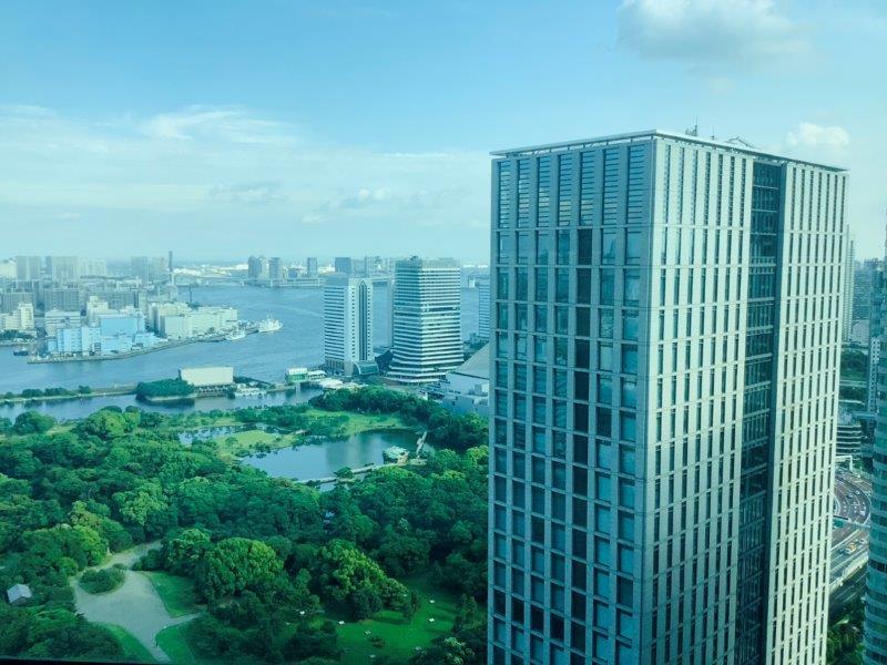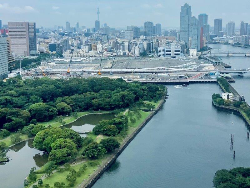 バルコニーから浜離宮のさらに向こうに現在の築地市場が見えました。変わりゆく東京のリアルタイムがここからも一望できます。
