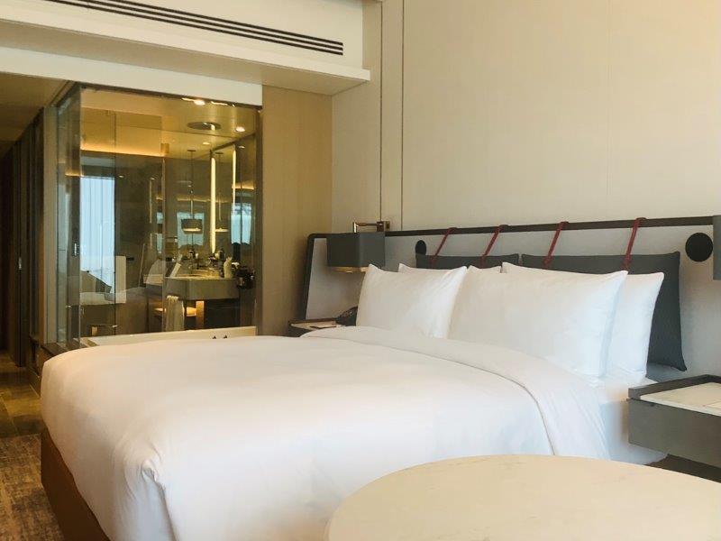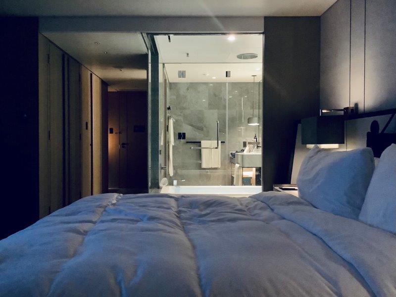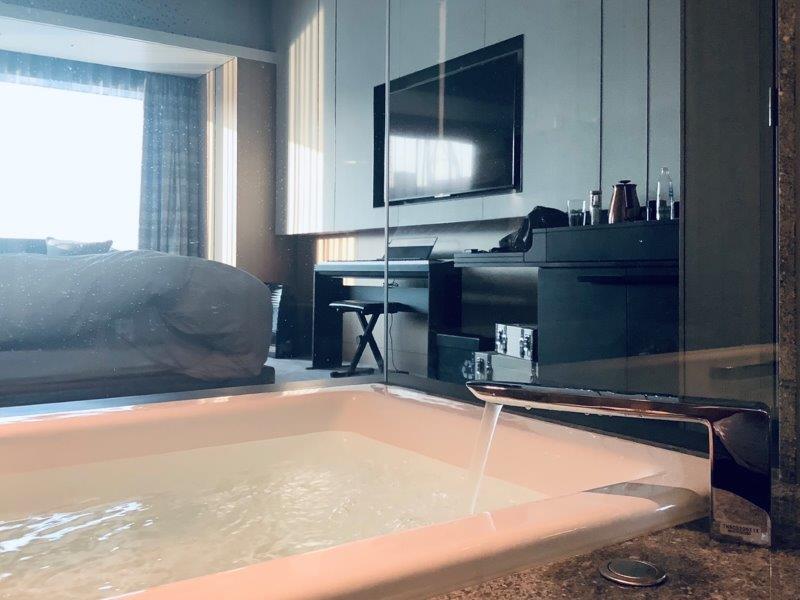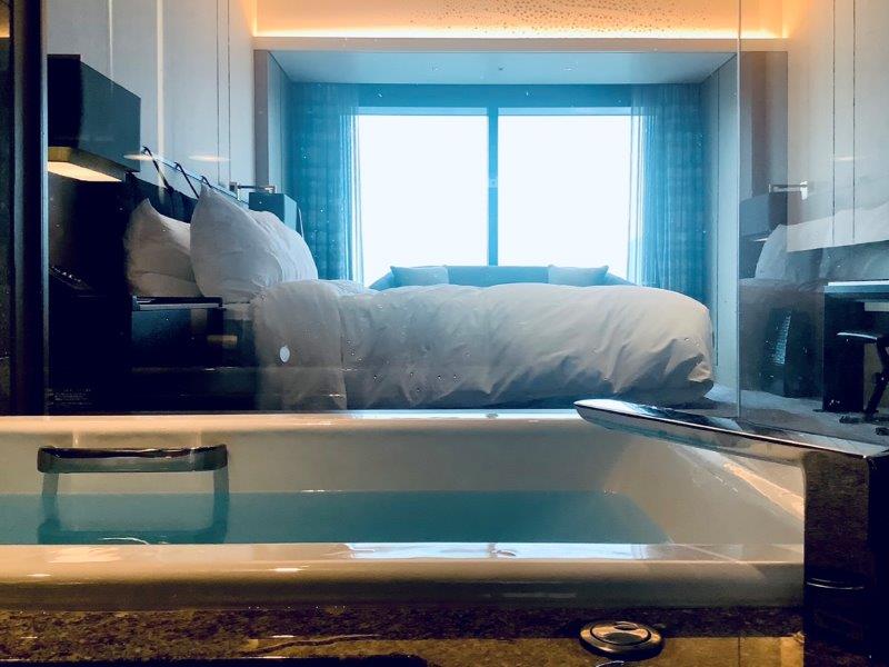 コーナーが解放されたシースルーのバスルームはより寝室との一体感が感じられ爽快です。