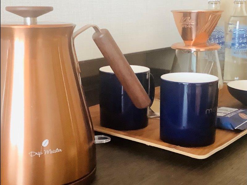 なんと筆ペンがアメニティに。コーヒーは粉をセットしてのドリップ式です。