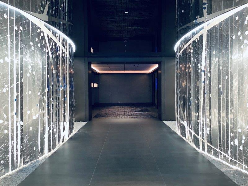 メタリッククールな世界のなかにアイコンカラーでもある深青色とマゼンダのアクセントが映えるラグジュアリーなロビー空間です。