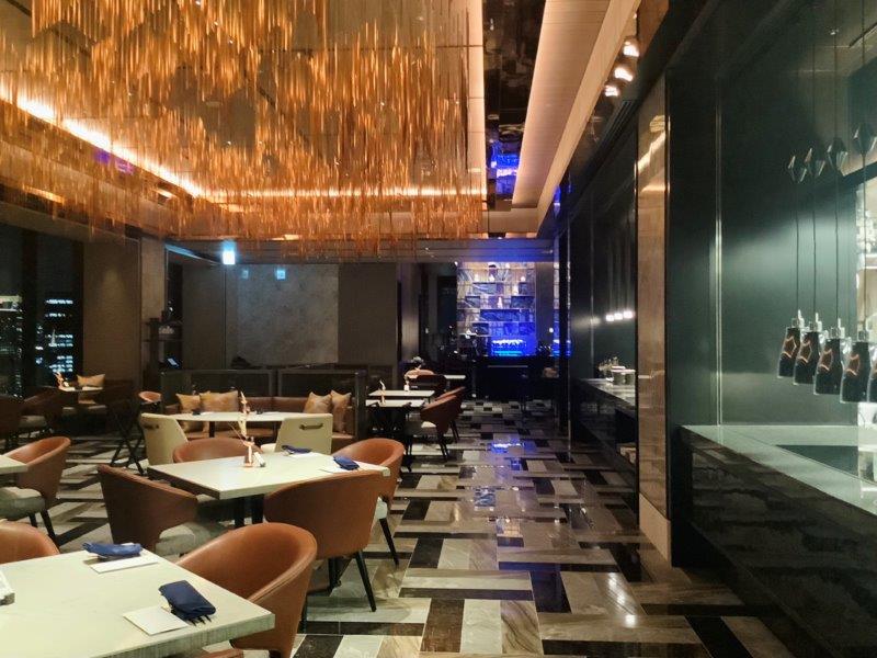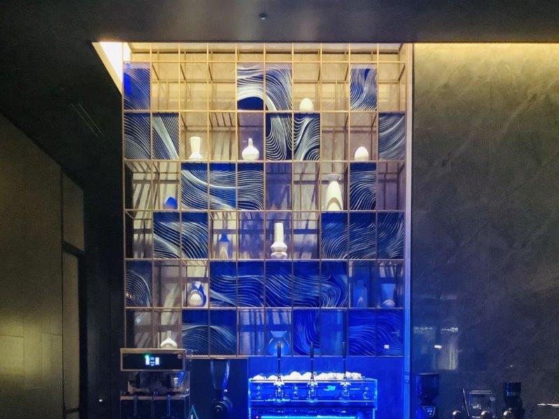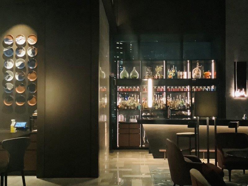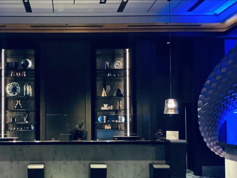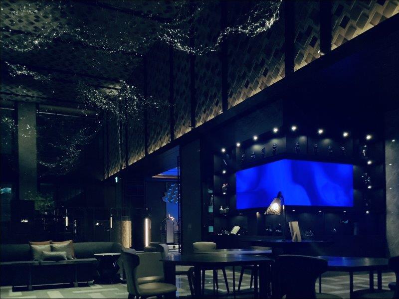 ホテルに戻ると、夜のロビーはさらにブレードランナーを思わせるようなライティング・オブジェが散りばめられ、サイバーパンク的雰囲気を醸しだしていました。