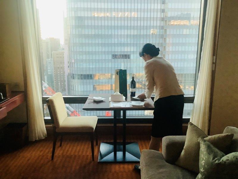 メイクレッスンの間私が待っていると、客室スタッフの方がウェルカムアメニティとワインをセットしてくれました。