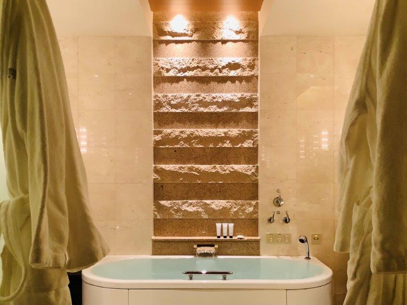 南からの陽を受けて目覚めたあと、シンメトリーなバスルームに鎮座する浴槽にしばし浸かります。