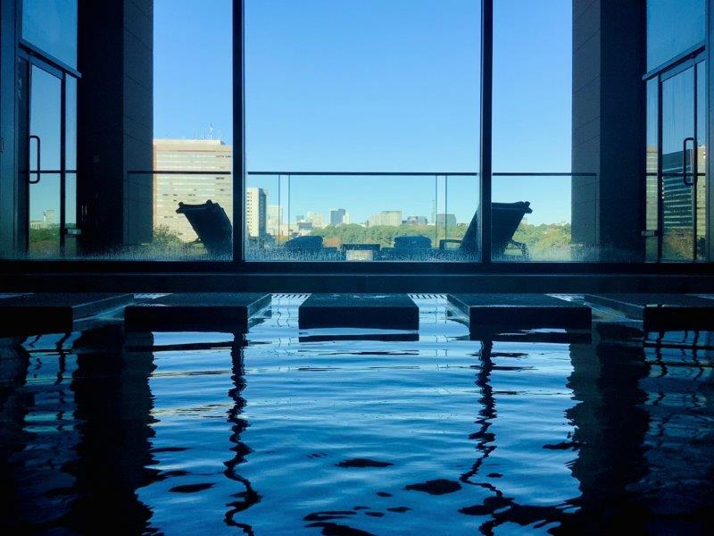 軽く泳いだあとは日比谷交差点を見おろしながらテラスでくつろぎます。