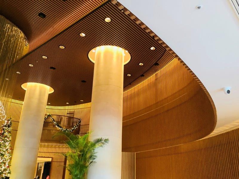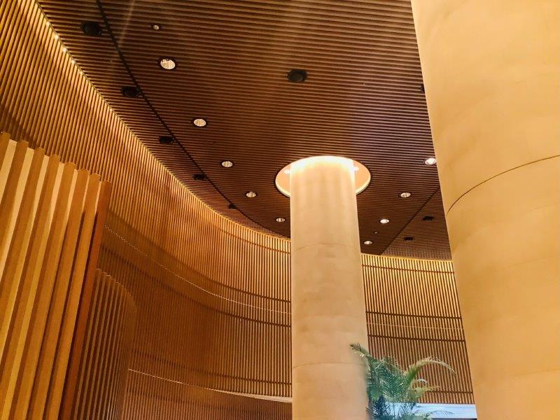 竹のアートワークや円形のロビーを囲い込む繊細な縦格子は14年前と変わらない暖かさで出迎えてくれます。