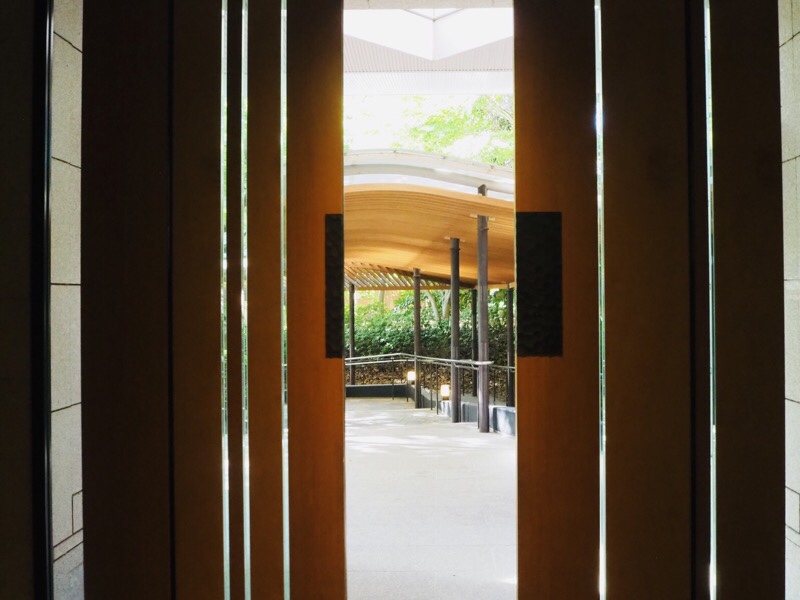 アプローチと木製の自動扉を抜けて館内にはいると、落ち着いたロビーに鎮座する黄金色の金物細工の門が出迎えます。